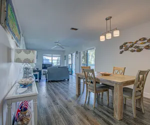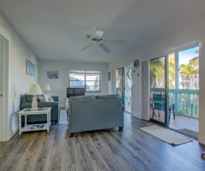 The Beach Palms 7A is a gorgeous 2 bedroom, 2 bathroom first floor condo that sleeps 6, a boat and fishing dock, heated pool, and 2 parking spots. The north balcony is a private balcony directly overlooking the heated pool and is accessed by 2 sets of sliding glass doors from the living room. The white sand beaches are 125 yards to the west which is a one minute walk. Enjoy the best of both worlds with Florida’s Intra-Coastal Waterway on the east side of the condo and the pool and Gulf of Mexico on the west side of the condo.