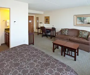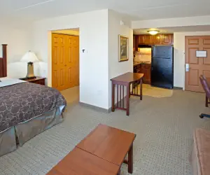 This air-conditioned STUDIO features 1 Queen bed. There is a pull-out sofa in the living area for additional guests. Curl up and enjoy your favorite shows on our flatscreen TV or watch your favorite movie with our DVD player. In-room movies are available on premium cable. You can easily connect with friends and family back home, courtesy of the complimentary Wi-Fi. Get some work done while you're away by taking advantage of the laptop-friendly space.