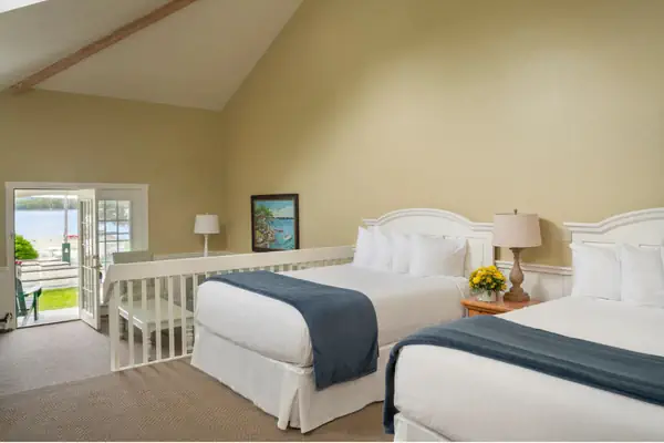 Retreat to our comfortable air-conditioned LODGE ROOM with 2 Queen beds. Curl up in front of the gas fireplace and watch your favorite show on the 40-inch flat-screen TV or connect with friends and family back home, courtesy of the complimentary Wi-Fi. You'll find a mini-fridge stocked with Poland Spring water and a Keurig coffee maker with an assortment of Green Mountain coffee and tea. In the evening, enjoy a glass of wine while sitting in the Adirondack or rocking chairs located on the private covered porch, which leads to beautifully landscaped grounds and views of the waterfront.
