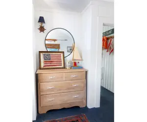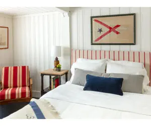 After a day on the water, retreat to our comfortable air-conditioned LIVING AREA with a lovely fireplace and beautiful decor. Curl up on the sofa and watch your favorite show on the 40-inch flat-screen TV or connect with friends and family back home, courtesy of the complimentary Wi-Fi. You'll find a mini-fridge stocked with Poland Spring water and a Keurig coffee maker with an assortment of Green Mountain coffee and tea. In the evening, enjoy a glass of wine and the view of the harbor on the private covered porch with traditional Adirondack chairs.