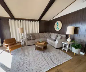• Living Area: spacious area with a 55" Google Smart TV, comfortable seating, board games