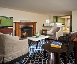 • Living Area: sofa bed, TV, fireplace, access to a private fully furnished patio and view of the golf course
