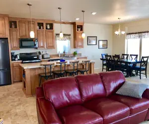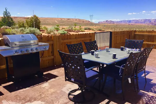 Newly built 3BD 2BA, (king, king, plus bunk room with a twin over twin and queen over queen) sleeps up to 10-12 in a tranquil neighborhood on the edge of Page; view of the Vermillion Cliffs from the FRONT courtyard-patio table and BBQ plus elevated front porch, minutes from downtown.