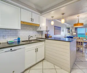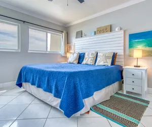 This condo can conveniently accommodate a party of 8. The master bedroom has a king-sized bed that comfortably sleeps 2, as well as a private, full bathroom attached to it. The guest bedroom has 1 queen size bed and 1 bunk bed along with an attached full bathroom that is also accessible from the living room area. The living room is equipped with plenty of comfortable seating for lounging and relaxing throughout the day during your breaks from the beach, as well as a pull-out sleeper sofa bed that can comfortably sleep 2. The total sleeping accommodations for this condo is 8 guests.
