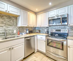 The kitchen is fully equipped with all major and small appliances including refrigerator, stove, dishwasher and microwave & more. Cookware, utensils, and table service are all included, with a private washer and dryer located conveniently inside the condo.