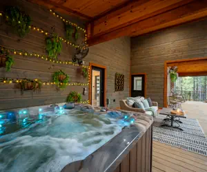 This gorgeous kitchen is stocked with everything you need to craft a delicious meal. From charcuterie boards to beautiful stemware the cabin provides everything you need to create the perfect set up. The kitchen has access to the private, oversized, back deck where you can lounge outdoors and spend your afternoons enjoying the gas grill, soaking in the hydrotherapy hot tub or cozied up with your favorite wine and a good book. The gas grill is a hard line so you don't have to worry about running out of propane.