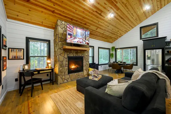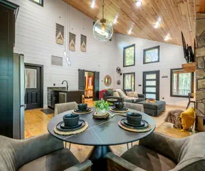Upon entering the cabin, the stunning picturesque windows in the dining area are the perfect backdrop to the open floorplan in the kitchen, living, and dining area. From high-end furnishings to all the little extras you will instantly feel called to lounge in the luxury the cabin offers. Bohemian Dreams will meet all your expectations for a relaxing, elegant stay in the piney woods of southeast Oklahoma.