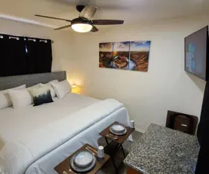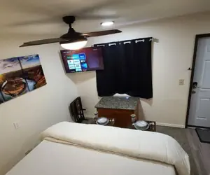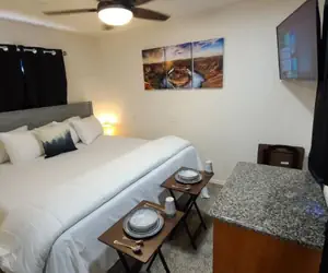 The location is in between the city of Williams, AZ, and the Grand Canyon South Rim. Although we use Williams’ zip code and city name in our address, our location is not inside the city of Williams, but it is 30 miles away from it. Please check the address with your GPS before driving to the location. From Highway 64 you will turn down a DIRT road called East Woodland Ranch Road. During winter months, it does snow, but most of the time the road is still drivable, even in cars. It is located inside a mobile home park that has streetlights and is fenced in, but the area around the mobile home park is desolate and old. However, with it being so isolated, star gazing is highly recommended while you stay with us. There is a gas station 5 miles from the location that sells small amounts of produce and snacks. We suggest bringing food with you because there aren’t many options nearby besides the gas station and small restaurant 5 miles away from the property. We have charcoal BBQ pits, gazebos, and picnic tables around the property for guests to use. If there are any problems with the room, please message me through the booking platform, as it’s the fastest way to receive a response. Please be courteous to people who live in or are traveling the area like yourself.