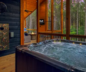 Key cabin highlights include: 6 person hot tub, oversized back deck with TV, front porch with sunset views, bunk bed nook, classic arcade console, foosball table, giant connect 4, tankless water heater, a grill grate over our fire pit to cook around the campfire... You will feel spoiled! Ride your ATV to the near by trails or enjoy a scenic walk and take in the beauty of the forest.