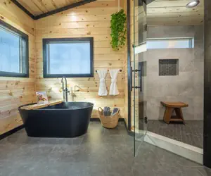This modern and beautiful kitchen lacks for nothing. Enjoy the butler’s pantry which offers ample storage space for guest’s groceries (a rare find), and an extended kitchen island that seats 4. This cabin offers an abundance of counter space and cabinets which come fully stocked with all cookware and accessories to prepare any meal. We didn't stop at just basic cook wear. You will have the the extras to enjoy during your stay; XL air fryer, toaster oven, snack boards, cast iron skillets, bar accessories, whisky glasses and more. Located off the kitchen is a half bath complete with full size washer and dryer. Laundry pods and dryer sheets provided for guest.