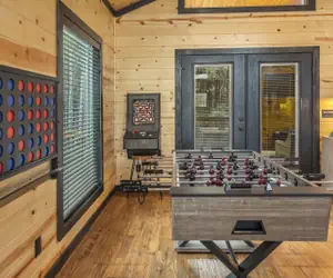 Off the living area you will find a full-size foosball table, giant connect 4 and an arcade console complete with over 200 classic arcade games. If you enjoy playing games and not having to decide what to do next... than this cabin is for you. Between the board games, corn hole, ring hook and table top shuffle board you can spend hours having fun and making memories.
