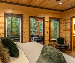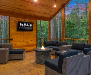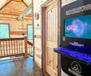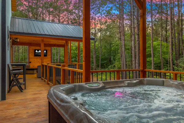 The King master suite is down stairs with an en-suite bath where you can enjoy the spa inspired soaking tub and walk in shower with dual shower heads. Upstairs you will find the loft area furnished with a cozy leather couch that converts to a full sleeper bed and coffee table making it the perfect setting for lounging or playing one of the many games provided. There is a full bath upstairs separate from the bedroom which is great if there are extra guest using the pullout sofa but it is still private to the upstairs area. The upstairs bedroom, complete with a King bed and two twin bunks, has its own private balcony for enjoying the evening stars! This cabin is the perfect layout for 2 couples or a large family.
