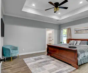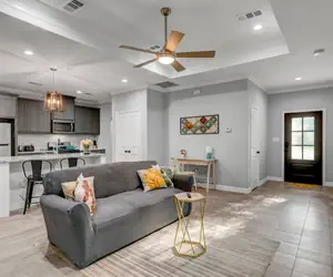 Remodeled in 2022, the home features sleek furnishings, warm decor, and stylish finishes throughout.