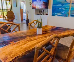 Dine indoors at the live-edge wood table or enjoy al fresco meals on the lanai with breathtaking golf and ocean views.