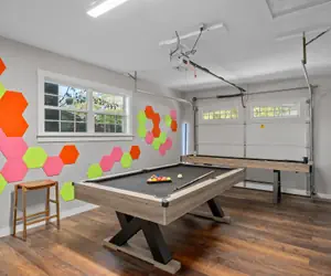 The custom game room is a guest favorite, packed with a pool table, shuffleboard, and a karaoke machine that guests call ("⭐️ such a fun touch!") ("⭐️ We had a blast singing karaoke and playing pool every night!") 🎤🍷