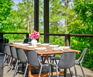 Step onto the expansive deck to enjoy a hot tub, outdoor fireplace, and comfortable seating under the stars. Grill enthusiasts will love the gas grill and large dining table for al fresco dining, while cornhole boards offer a fun competitive touch. Enjoy a cozy campfire under the stars and twinkling string lights, with firewood provided for guests.