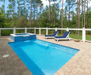 The outdoor space is where 'Emerald Tide' truly shines. Spend your days lounging by the pool, unwinding in the spa, or enjoying meals on the screened-in lanai, which features a built-in natural gas grill, fireplace, and mounted TV. Watch the kids splash and cannonball while you soak in the Florida sunshine from comfortable wicker seating.