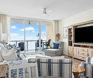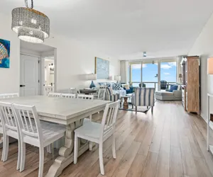 The Living Room area features a large screen Smart TV, plenty of seating, endless views, and a queen-size sleeper-sofa. There is plenty of room for everyone to gather after a day on the beach.