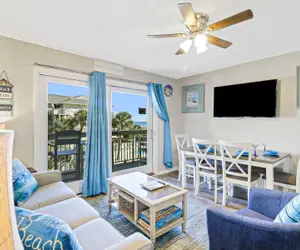 The fully equipped kitchen includes stainless steel appliances, cookware, coffee maker, Keurig, and dining space for six. Guests also enjoy the convenience of an in-unit washer and dryer, high-speed Wi-Fi, air conditioning, ceiling fans, and quality linens. Beach chairs, an umbrella, cooler, and toys are provided for easy days by the water.