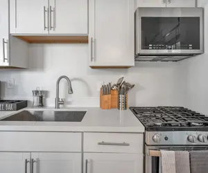 The modern kitchenette is fully stocked with all the essentials to make cooking a breeze — gas stove, microwave, refrigerator, Keurig coffee maker, blender, and toaster. A sleek white design and marble accents make it feel fresh and upscale.