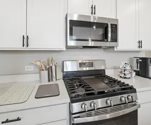 The kitchen is fully equipped and designed to be both functional and inviting, featuring a large island, gas stove and oven, and a full Ninja coffee station that brews both pods and ground coffee — complete with a built-in frother for your morning routine. Adjacent to the kitchen is a dining area that comfortably seats four, perfect for shared meals or casual work time.