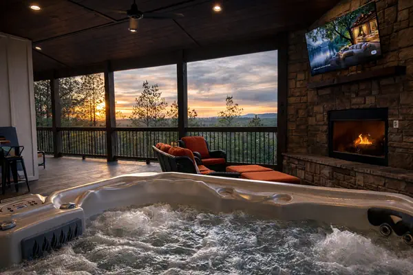 • Covered back porch with hot tub, gas fireplace & Smart TV 💦🔥