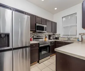 - Kitchen: The kitchen of this charming townhome is open to the living room allowing the cook of the day to keep an eye out on the big game in between meal prep chores. Offering dark cabinets that provide a dramatic contrast to the white walls and countertops, updated appliances help bring joy back to cooking. A breakfast bar takes up one end of the kitchen giving guests the option of enjoying their morning donuts in this place or spending a few quality moments in casual conversation with the one who is doing the cooking.