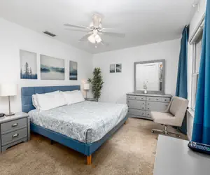 - Bedroom 2: The king master suite is up a single flight of stairs, offering a comfy place to sleep, relax, and shut away the rest of the world. Decorated in calming shades of gray and white, the upholstered headboard supports tired necks and shoulders as occupants watch the flat-screen television resting on the dresser across the room. A soft occasional chair gives guests a comfortable place to sit and read and the ensuite bathroom features an oversized tub/shower combo and another single vanity.
