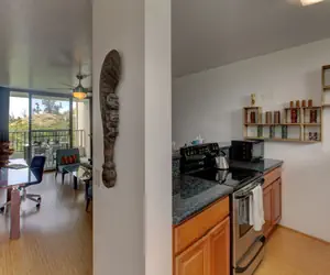 The kitchen has everything you need to cook up those delicious island meals! The living room has a desk for a comfortable workspace. There's a king bed in the bedroom, and the bathroom is a tub/shower combo.