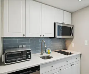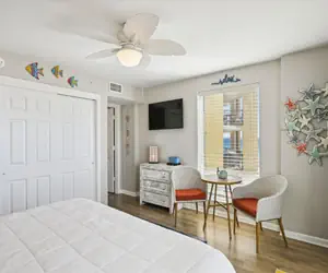 The A portion of this condo has its own kitchenette which includes a small fridge, coffee maker, and microwave. There is also a Washer and Dryer on the A side of the condo. The bedroom on the A side has a small seating area in the bedroom and a King-sized bed. This spacious room also offers access to its own balcony space with amazing views.