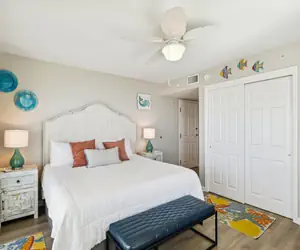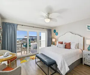 Seacrest is a family-friendly complex located on Okaloosa Island with amenities such as a large outdoor pool, indoor pool, family BBQ area, and a fitness room.