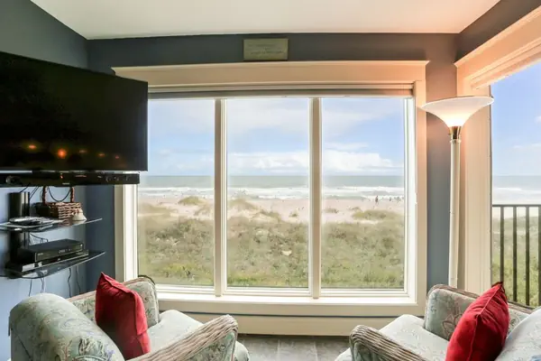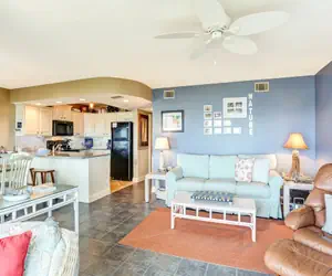 The master bedroom is a serene haven, featuring a comfortable king-sized bed, while the second bedroom offers two twin beds, perfect for children or friends. Both bedrooms are designed for relaxation and comfort, ensuring a restful night's sleep after a day of beach adventures. Additional sleeping space is available with a queen sleeper sofa in the living area.