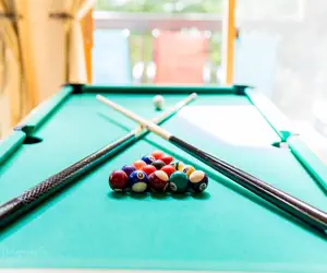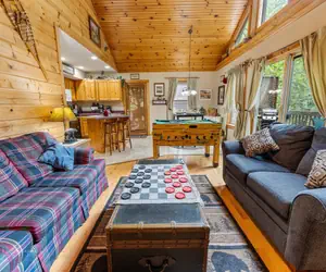 Step inside this relaxing retreat and find wooded views, an inviting living area complete with comfortable seating, a ceiling fan, a large flat-screen Roku TV, and a gas fireplace. The living room has ample lighting and porch access. Have some friendly competition in a fun game of checkers, a round of pool, or a friendly competition of Foosball. This cabin offers plenty of games to choose from, including a convertible game table. Wifi can be found throughout the cabin. The sleeper sofa pulls out to make a Queen-size bed. (Linens provided)