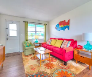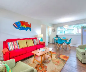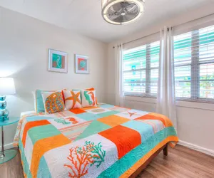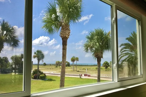 FANTASTIC location! Direct BEACHFRONT! NO streets to cross! CHARMING 1 bedroom condo with stunning views of the Gulf of Mexico. This second-floor updated unit features a bedroom with a king size bed, large dresser, nightstands, TV and large closet. Bathroom with tub/shower is down the hall. The fully equipped kitchen and living area is furnished with a dining table, queen size sleeper sofa, vintage barrel chairs and a 55” SMARTTV with cable, or use your Netflix, Hulu, or Sling accounts. Come and enjoy this unit which is furnished with a retro 50's feel but with all the modern conveniences of home. Free WIFI.