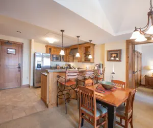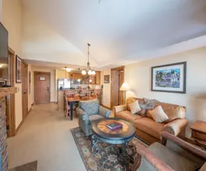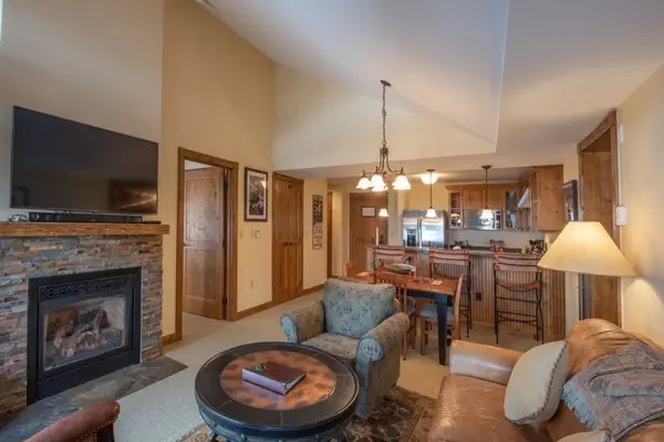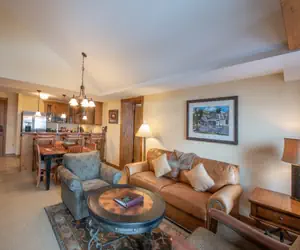 This top floor two bedroom, three bathroom condo unit is conveniently located in the Lodge at Mountaineer Square just steps from the slopes. This unit features high vaulted ceilings and large windows allowing in an abundance of natural light. Four people can sleep comfortably in this unit or utilize the sleeper sofa in the living room to sleep a maximum of six people. The master bedroom has a large king-size bed with a spacious master bathroom. The second bedroom holds a king-size bed with a private bathroom. There is also a full bathroom off of the main living area. A gas fireplace, balcony with a great courtyard view, TV in each room, high speed Wi-Fi, washer and dryer, and a fully equipped kitchen with a dishwasher make this the perfect home base for your Crested Butte vacation.