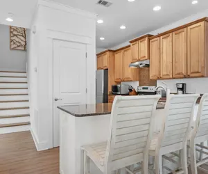 This home has a full kitchen, granite countertops, stainless appliances, and a large breakfast bar where you can cook your own meals. The dining area just off the kitchen has plentiful seating for 8 and additional seating for 4 at the bar. Both the kitchen and dining space are open to the living area, allowing your entire group to be together, whether dining or relaxing.