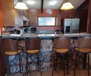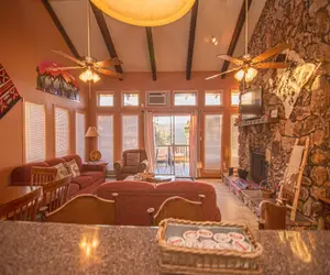 Take a trip to this 6-bedroom, 2 kitchens, and 5-bath vacation rental condo in Ruidoso! Nestled in a quiet neighborhood, this condo promises plenty of room for family, friends, church groups, spring breakers, and sports teams all the same! It's a sweet treat for anyone, anytime - with 2 wood burning fireplaces for the winter, and a swimming pool in the summer. Whether you prefer to play at the billiards table, mix drinks at the wet bar, or crack a cold one on the balcony, find your home-away-from-home at this abode!-- THE PROPERTY --Free WiFi | 2 Private Decks & Game Room | Pets Welcome | Community Pool open from Memorial Day to Labor Day | 3,367 Square Feet | 65 Inch TV in living room with ROKU/Satellite/Gamimg HookupIdeal for large family retreats or group getaways to the Sierra Blanca Mountains, this expansive family-friendly condo boasts a top-notch entertainment area, ample old-world charm, and a prime location just under a mile from the heart of Ruidoso.The bottom floor has 2 bedrooms and a bathroom and an exterior entrance. The next floor up has a bedroom, living room, kitchen, bathroom, and 2 sofas that each fold out into large sleeper sofas and this floor also has a exterior entrance. The next floor up has three bedrooms, and two bathrooms that share a shower. This is the floor that has the front door. The next floor up is the top floor that has the kitchen, bathroom, dining room, laundry room, large deck with furnture and a grill. The unit has over 3400 square feet and is very large and it is all one unit.Master Bedroom: King Bed | Bedroom 2: King Bed| Bedroom 3: Queen Bed | Bedroom 4: King Bed, Bedroom 5: Queen Bed | Game Room: King Bed, | Living Room: 2 Queen Size Sofa Sleeper Pullout Beds I Bedroom 6: King Bed| All bedrooms with 32 inch TV with ROKU and gaming hook up STEP OUTSIDE: Private balcony w/ outdoor dining table, lighting, gas grill, forested & mountain views, community pool accessINDOOR LIVING: Rustic furnishings, mountain-themed decor, exposed wood beams, 2 stone-surrounded wood-burning fireplaces, 7 flat-screen cable TVs, ceiling fans, mountain-themed decor, ample natural sunlight, dining table.GAME ROOM and SECOND KITCHEN: Pool table, wet bar w/ drip coffee maker, stove top, refrigerator, and bar seating, wood-burning fireplace, 45 inch TV with surround sound, ROKU, gaming hookup, and satelliteKITCHEN: Fully equipped, Corian countertops, large amount of pots and pans, kitchen fully equipped, drip coffee maker, tea kettle, microwave, breakfast barGENERAL: Central heating, air conditioning, linens & towels provided,, washer/dryer, pet fee (paid pre-trip)PARKING: Designated (2 vehicles) additional cars can park at office by the pool which is a very short walk-- THE LOCATION --GET OUTSIDE AND EXPLORE: Two Rivers Ruidoso River Park (1.5 miles), Grindstone Stables (1.9 miles), Ruidoso Winter Park (6.3 miles), Smokey Bear Historical Park (19.2 miles), Fort Stanton-Snowy River Cave National Conservation Area (21.5 miles)GOLF THE DAY AWAY: Cree Meadows Public Golf Course (0.7 miles), Links At Sierra Blanca (2.7 miles), Alto Lakes Golf & Country Club (7.4 miles), Kokopelli Club (7.8 miles), Outlaw Lakes Golf & Country (12.2 miles), Golf Club At Rainmakers (13.0 miles)LOCAL ATTRACTIONS: Town Center (0.5 miles), Ruidoso Downs Race Track (4.9 miles), The Hubbard Museum of the American West (5.1 miles), Casino Apache Travel Center (5.2 miles),FAMILY ENTERTAINMENT: Pillow's Funtrackers (1.5 miles), Adventure Mountain (2.4 miles), Seeping Springs Trout Lakes (8.9 miles), Ski Apache (17.9 miles), Ski Cloudcroft (45.1 miles)AIRPORT: Sierra Blanca Regional Airport (16.4 miles)-- POLICIES --- No smoking- Pet friendly with a $100 fee per visit per pet (max 2 dogs allowed)- Please note the property is not suitable for mobility-impaired- Property is 4 stories- Must be at least 25 years old to book- Additional fees and taxes may apply- Photo ID may be required upon check-in