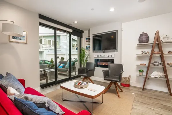 Front courtyard with fire-pit is accessible from the Great Room with end to end hide-away sliding doors to provide an indoor/outdoor lifestyle. A fresh feeling kitchen with stainless Wolf range, stainless farmhouse sink, butler pantry and multiple serving areas with quartz counter-tops make entertaining a dream. Surround sound and dimmable LED lighting for comfortable sleep and beach dreams on summer nights.