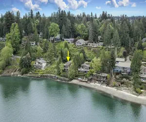 With 155 ft of low bank waterfront, enjoy panoramic views of the Puget Sound against the backdrop of the Olympic Mountains from this mid-century modern designed and outfitted home on quiet and private Raft Island located an hour south of Seattle in the beautiful Pacific Northwest.