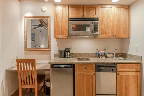 This Emmons king studio unit is the most affordable lodging in Crested Butte with two king beds. This top floor, spacious studio unit is updated with new carpeting and paint. Both king beds are pillow-top Serta perfect sleeper mattresses, but one remains tucked against the wall as a murphy bed. These units include TV, dresser and a galley kitchenette. The kitchenette is equipped with a one-burner stove-top, microwave, mini fridge, dishwasher, coffee maker, dishware for 4, as well as cookware and cutlery. Whether you're staying for a night or a week, this unit is the perfect base for your Crested Butte adventure.