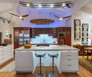 The upstairs master-suite features a four-post, king-sized bed with soft linens, and endless views as the sun rises. There are two other bedrooms upstairs and an additional junior suite on the downstairs level. In addition, there is a kid’s bunkroom on the lower level with six beds and an additional bathroom. All of the bedrooms are uniquely themed and feature local art and modern décor that truly give the home its effortless Hawaiian beach vibe.