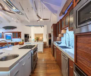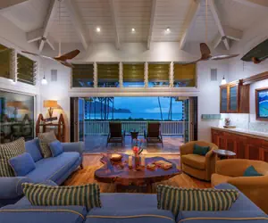 “Hanalei Dream” is a beautiful, 4700 square-foot, two-story modern home and features all the aspects of quintessential indoor/outdoor living. With five bedrooms, multiple entertainment areas, and endless covered lanais, there is ample space for large groups to spread out. The upstairs chef’s kitchen features beautiful quartz counters, a six-burner gas range/oven, and sub-zero fridge. It’s outward facing layout means you’ll never miss out on views, even while preparing meals. There are multiple areas in the home to dine – choose an expansive table off the kitchen or the outdoor screened-in lanai for intimate gatherings. Or opt for preparing meals in the outdoor kitchen which features a magnificent, stainless-steel Kalamazoo grill and built-in pizza oven.