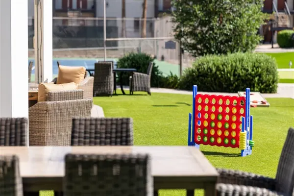 Our community features a gorgeous, large outdoor community space with a fireplace, abundant seating, bocce ball and other outdoor lawn games; 3 grilling stations, heated pool and hot tub, additional seating areas and misters for those warm Arizona days.