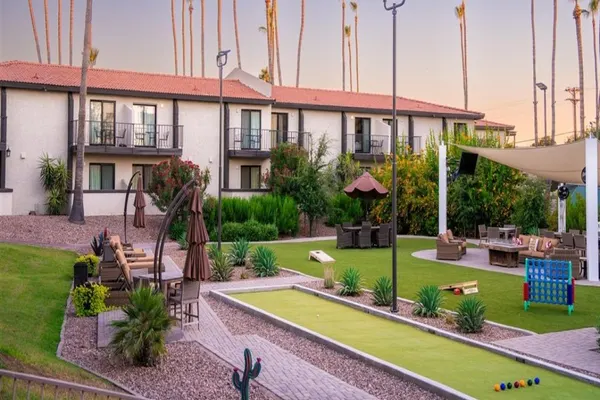 Our community features a gorgeous, large outdoor community space with a fireplace, abundant seating, bocce ball and other outdoor lawn games; 3 grilling stations, heated pool and hot tub, additional seating areas and misters for those warm Arizona days.