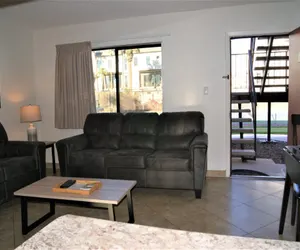 Use your private entrance to enter this particular home located on the first floor, and facing the Greenbelt! This suite has been remodeled to include beautiful upgraded furniture, tile, cabinets, and more! Furnished with a king size bed, your suite has all you need to feel right at home from the moment you walk through the front door. Each unit has a spacious living room with a dining area; walk through kitchen with full size appliances; and a bedroom with an attached bathroom, large walk in closet, and private patio (balcony)!