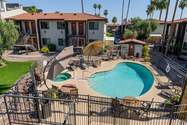 Our community features a gorgeous, large outdoor community space with a fireplace, abundant seating, bocce ball and other outdoor lawn games; 3 grilling stations, heated pool and hot tub, additional seating areas and misters for those warm Arizona days.