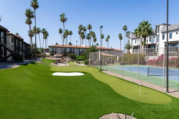 Our community features a gorgeous, large outdoor community space with a fireplace, abundant seating, bocce ball and other outdoor lawn games; 3 grilling stations, heated pool and hot tub, additional seating areas and misters for those warm Arizona days.