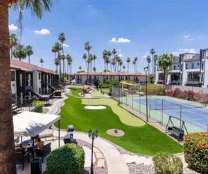 Our community features a gorgeous, large outdoor community space with a fireplace, abundant seating, bocce ball and other outdoor lawn games; 3 grilling stations, heated pool and hot tub, additional seating areas and misters for those warm Arizona days.