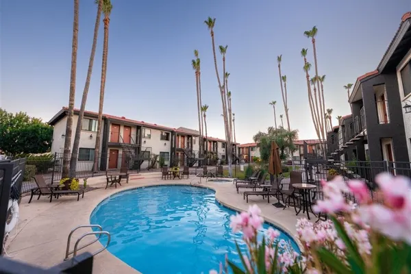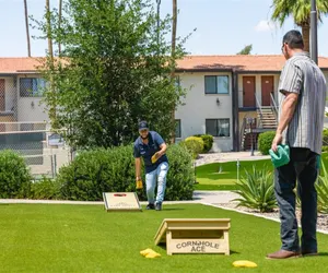 Our community features a gorgeous, large outdoor community space with a fireplace, abundant seating, bocce ball and other outdoor lawn games; 3 grilling stations, heated pool and hot tub, additional seating areas and misters for those warm Arizona days.