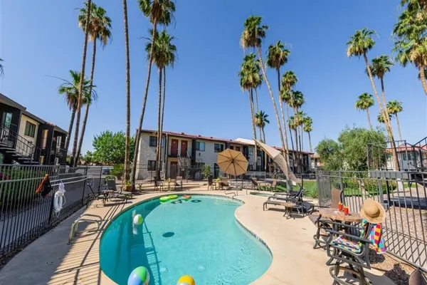 Our community features a gorgeous, large outdoor community space with a fireplace, abundant seating, bocce ball and other outdoor lawn games; 3 grilling stations, heated pool and hot tub, additional seating areas and misters for those warm Arizona days.